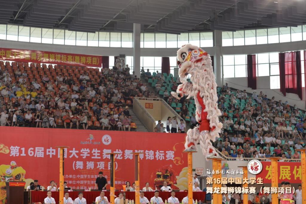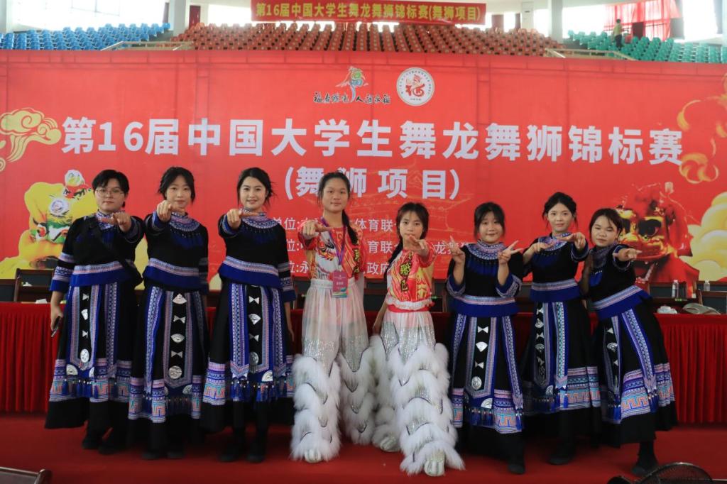 本次大赛由中国学生体育联合会主办,永福县人民政府承办,为期三天,共吸引了来自全国43所高校的400余名舞狮运动员齐聚一堂,共同角逐。比赛现场气氛热烈,鼓声雷动,参赛选手们身着鲜艳的龙狮服饰,伴随着传统乐器的节奏,呈现了一场场精彩绝伦的表演。面对强劲的对手和高难度的挑战,我校“高凉南狮”队磨练出“咬定青山不放松”的坚韧品格,以“百折不挠、激昂斗志”迎难而上。男子队以“雄狮奋进启航新时代”为主题,勇敢飞跃高桩,展现出无畏的气概;女子队则以“八朵金花”的英姿铸心为铠,以青春之姿生动诠释了体育精神与传统文化的完美融合。