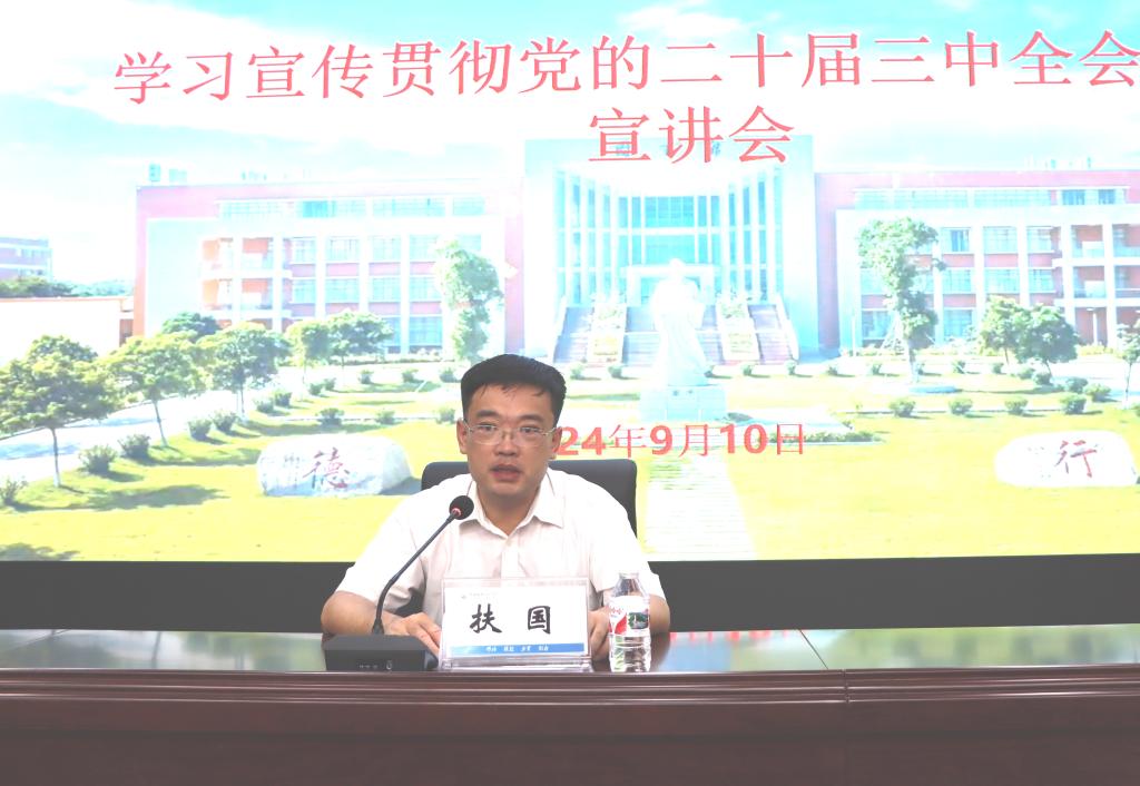 扶国从深入学习领会习近平总书记在全会上的重要讲话精神、全面准确理解《中共中央关于进一步全面深化改革、推进中国式现代化的决定》提出的进一步全面深化改革的重大举措、全力以赴抓好全会精神贯彻落实等方面,对全会精神作了全面系统的阐释和宣讲。他指出,党的二十届三中全会,是在全党深入学习宣传贯彻党的二十大精神、全面建设社会主义现代化国家开局起步的关键时刻召开的一次十分重要的会议,对当前和今后一个时期的重点工作提出了明确要求,高屋建瓴、思想深邃、内涵丰富,具有很强的政治性、思想性和指导性,为我们推动高质量发展、做好各项工作提供了根本遵循。要深刻认识党的二十届二中全会以来党和国家事业取得的重大成就,深刻认识进一步全面深化改革的主题,深刻认识进一步全面深化改革的重要性和必要性以及深刻认识“六个坚持”的重大原则。要把学习贯彻全会精神同学习领会习近平总书记关于全面深化改革的一系列新思想、新观点、新论断相结合,加强党对进一步全面深化改革全过程的领导,以钉钉子精神抓好教育综合改革的落实,务求取得实效。