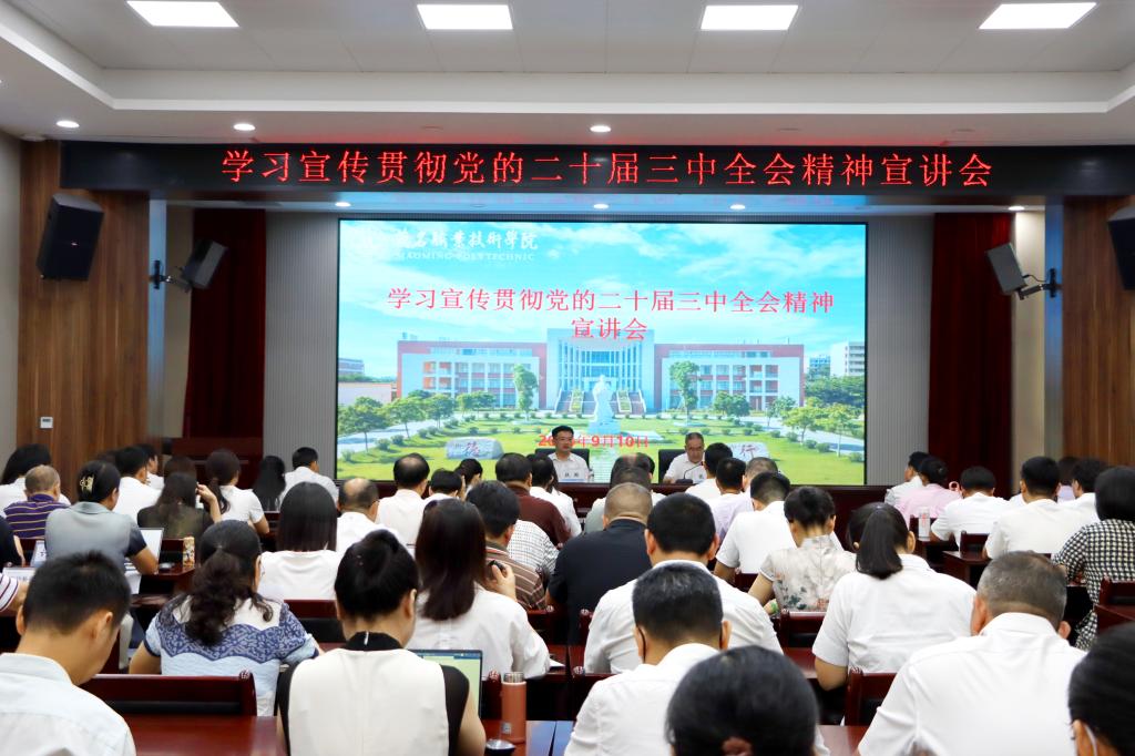 为深入学习宣传贯彻党的二十届三中全会精神,教育引导广大党员干部和师生把思想和行动统一到党中央的决策部署上来,切实把党的二十届三中全会精神转化为推动学校改革发展的强大动力,在全国第40个教师节之际,9月10日上午,学校在北校区多功能报告厅举办学习宣传贯彻党的二十届三中全会精神宣讲会。学校领导,各单位(部门)负责人,各系党总支副书记,受表彰教师代表及新进教师等共100多人参加。学校党委书记扶国作专题宣讲,党委副书记、院长张庆主持会议。