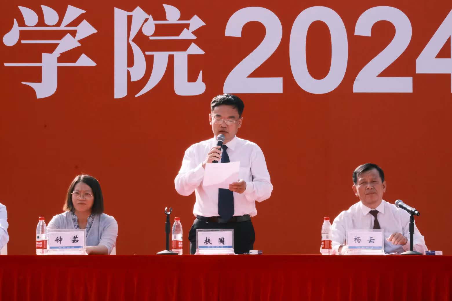 党委书记扶国,党委副书记、院长张庆分别讲话,代表学校向来自全国各地的5000余名新同学表示热烈的欢迎!他们表示,当代中国青年是与新时代同向同行、共同奋进的一代,有理想抱负、家国情怀和责任担当的一代。他们殷切希望:一是自觉挺膺担当,交出无愧时代的青春答卷。主动把人生理想融入国家和民族的事业中,顺应时代发展、响应时代号召、展现时代担当;二是锤炼品德修为,夯实梦想启程的发展根基。秉承“修德 强技 求实 创新”校训,积极参加志愿服务,主动承担社会责任,热诚关爱他人,争当德智体美劳全面发展的时代新人;三是重新出发,争当职业技能赛道的领跑者。敢于追求卓越、勇于质疑传统观念、善于突破技术瓶颈,在发展新质生产力的赛道上奋力奔跑,用创新的力量创造新的人生发展机遇。