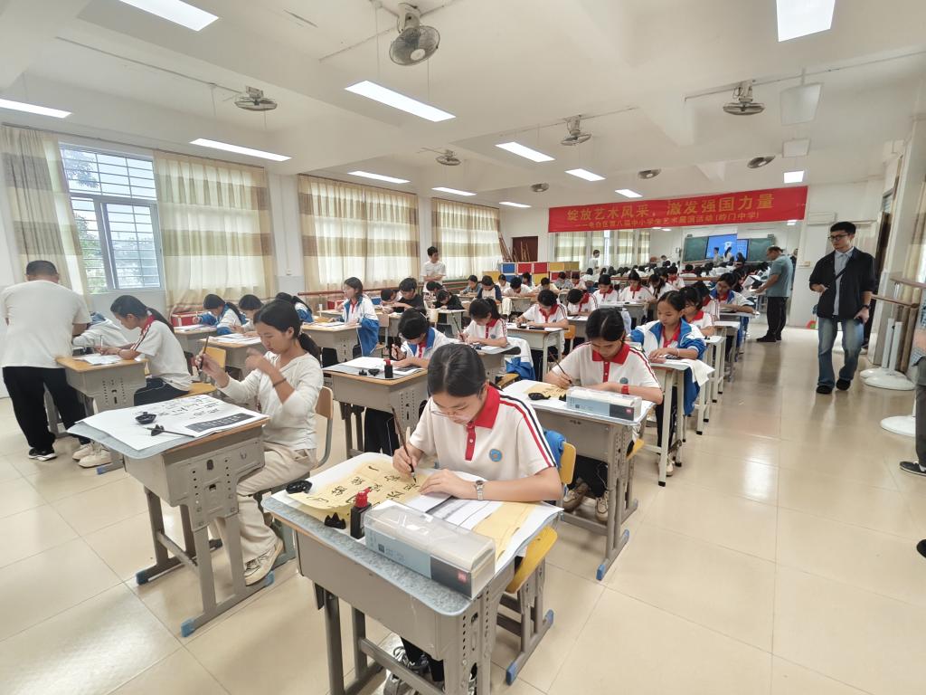会后,基础课部教师与岭门中学教师精诚合作,分别在书法教室和操场开展了“书写中国文字,传承中华文化”书法竞赛和“舞动雄狮魂,绽放少年志”南狮模仿赛两项美育体育浸润活动。书法比赛中,选手们神情专注,一笔一划地书写着对汉字的热爱。运动场上,学生们使出浑身解数,模仿南狮的各种经典动作。活动不仅让岭门中学学生感受到中国传统文化的魅力,更激发了他们对美育和体育的热爱,培养了艺术修养和健康体魄。