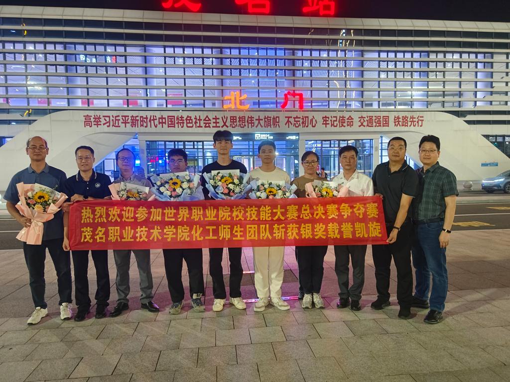11月1日晚上,获悉参赛师生团队载誉归来,学院副院长董利带领教务部负责人、化学工程系班子成员一行早早地来到了茂名高铁站,手捧鲜花和横幅,满怀期待地等待着获奖师生的归来。在迎接现场,董利亲自上前送上鲜花,与参赛师生一一握手并亲切交流,对他们的辛勤付出和取得的优异成绩表示热烈的祝贺和衷心的感谢。