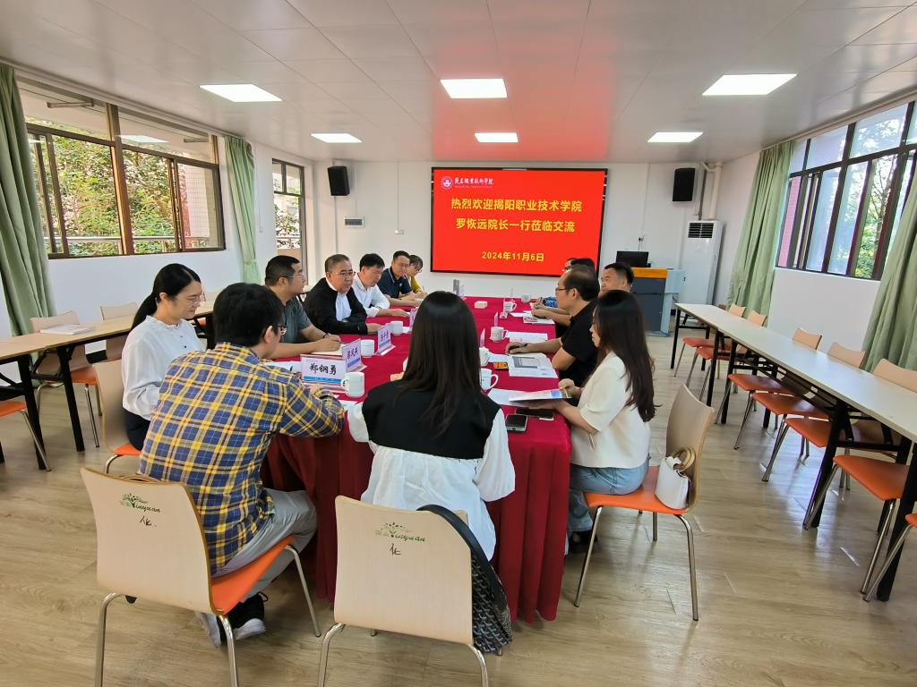 11月6日下午,揭阳职业技术学院党委副书记、院长罗恢远一行7人来到我院进行访问交流。学院党委副书记、院长张庆,副院长董利以及教务部、化学工程系负责人,学生工作部相关人员等热情接待了来访的客人,双方进行了深入探讨与交流。