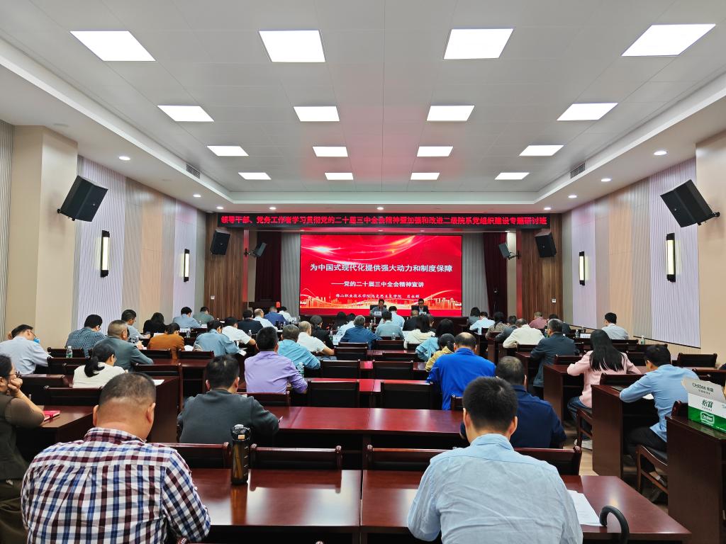 集中授课学习后进行分组研讨。参会人员分成三个讨论组,以“贯彻落实党的二十届三中全会精神,推进学校高质量发展”“加强和改进二级院系党组织建设,进一步增强党总支的政治功能和组织功能”为主题进行研讨。参会人员踊跃发言,以推动自身工作岗位改革创新作为出发点为学校高质量发展建言献策。大家一致表示:要把党的二十届三中全会精神和进一步全面深化改革要求落实到学校各项工作当中,以制度建设为保障,以干部队伍建设、岗位管理改革、绩效分配改革为引领,以增收创收为重点,敢动真格、敢碰钉子,才能完成学校“十四五规划”和“省域双高”建设的各项任务,推动学校高质量发展。(文/图:组织人事部)