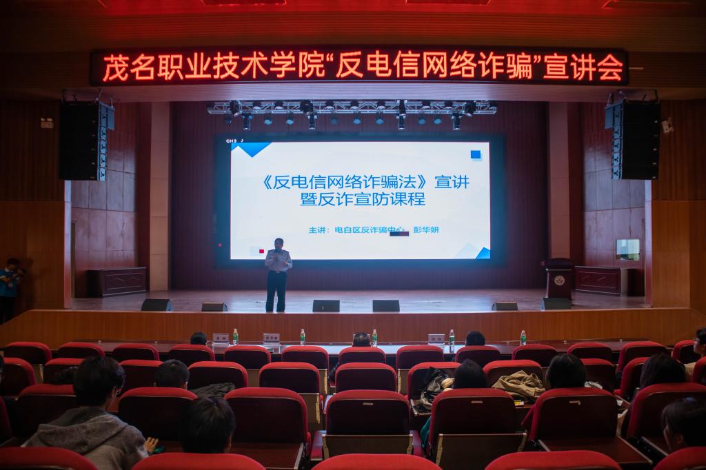 为提升全校师生的防骗意识和反诈能力,切实保障师生财产安全, 11 月 28 日下午,我校联合公安局、中国人民银行、中国工商银行分别在北校区和南校区举办了 “反电信网络诈骗” 宣讲会。学校党委专职副书记董荣权、中国人民银行茂名市分行副行长陈一波、茂名市反诈骗中心主任李丹、中国工商银行茂名分行副行长李文波、联合单位相关人员及学校师生约900人参加了活动。