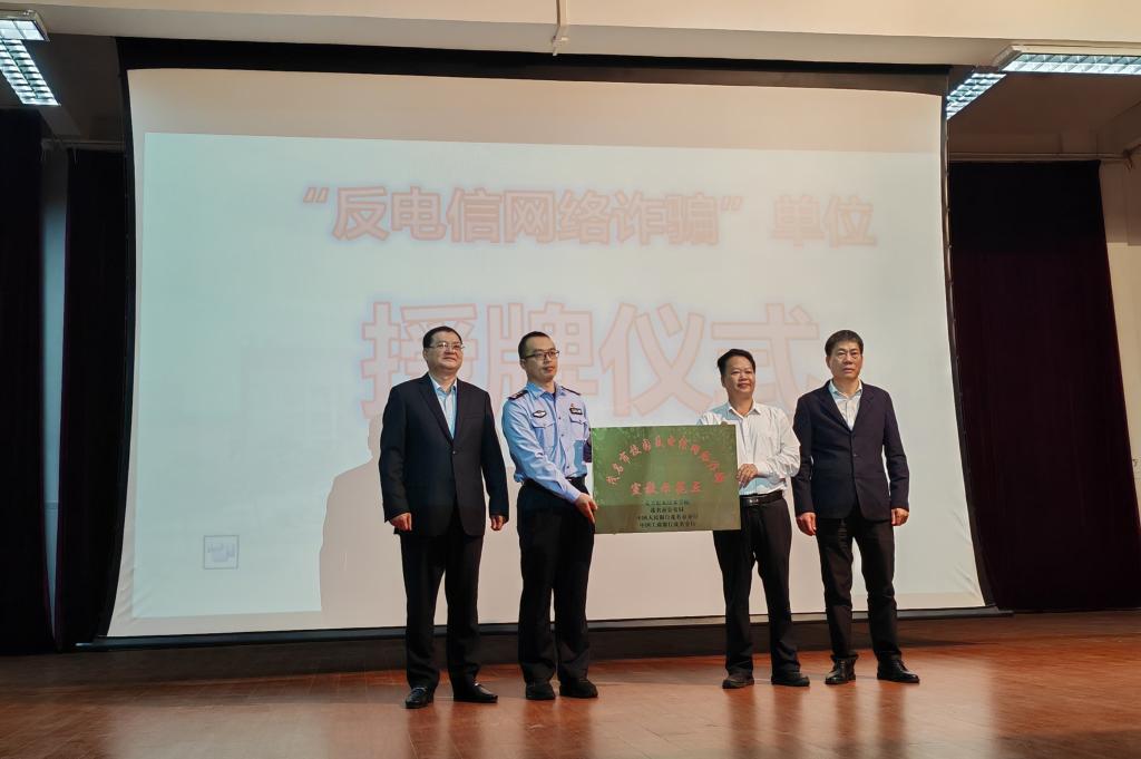 在北校区会场,举行了“反电信网络诈骗”宣教示范点授牌仪式,董荣权副书记代表学校接受“反电信网络诈骗”宣教示范点牌匾,充分展现了我校与各方力量团结一致、共同打击电信网络诈骗的坚定决心,为后续的反诈工作奠定了坚实的合作基础。