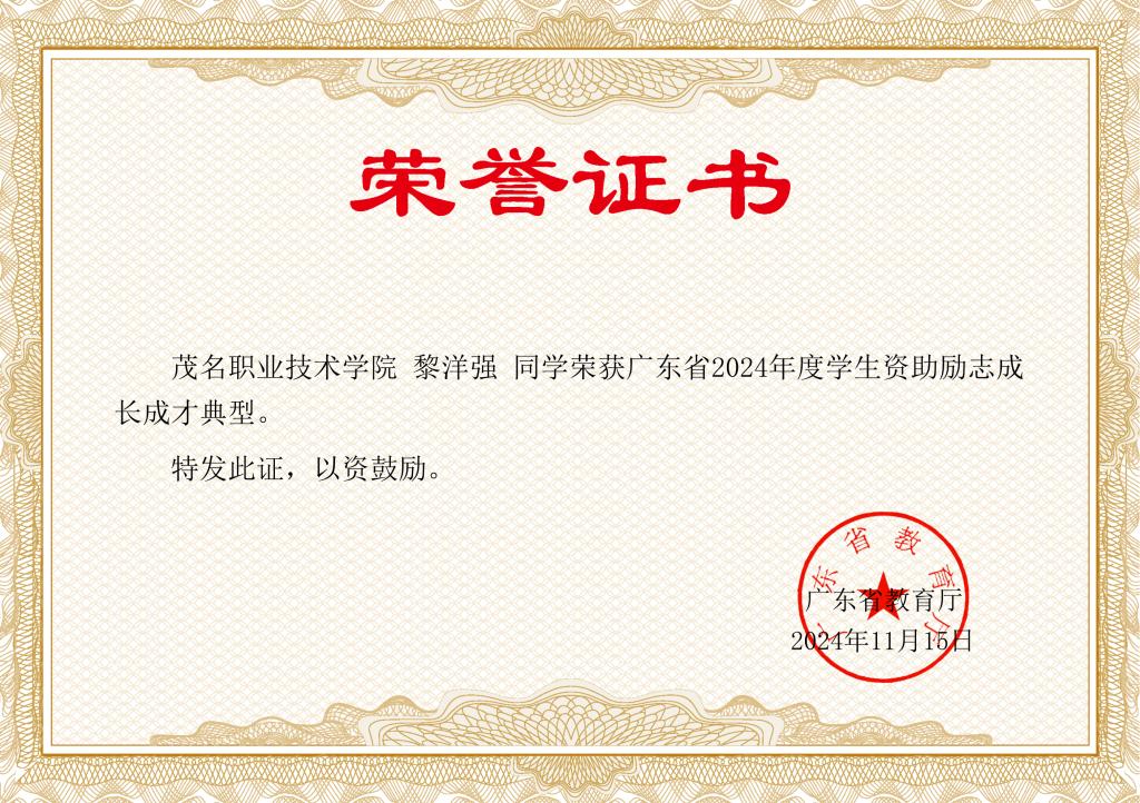 近日,我校机电信息系2022级工业机器人专业黎洋强同学荣获“广东省2024年度学生资助励志成长成才典型”。目前,全校仅一人获此荣誉。