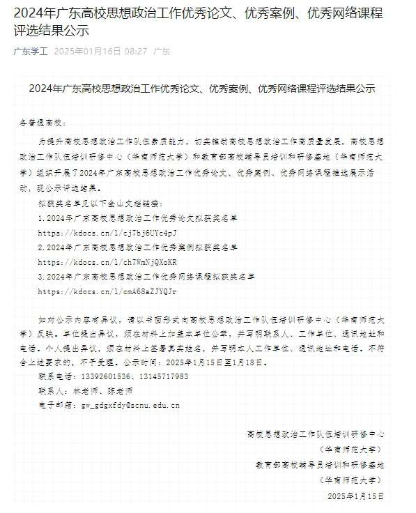近日,高校思想政治工作队伍培训研修中心(华南师范大学)和教育部高校辅导员培训和研修基地(华南师范大学)组织开展了2024年广东高校思想政治工作优秀论文、优秀案例、优秀网络课程推选展示活动,旨在进一步提升全省高校思想政治工作队伍的专业素质能力,切实推动高校思想政治工作高质量发展。