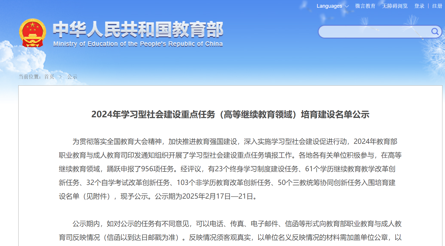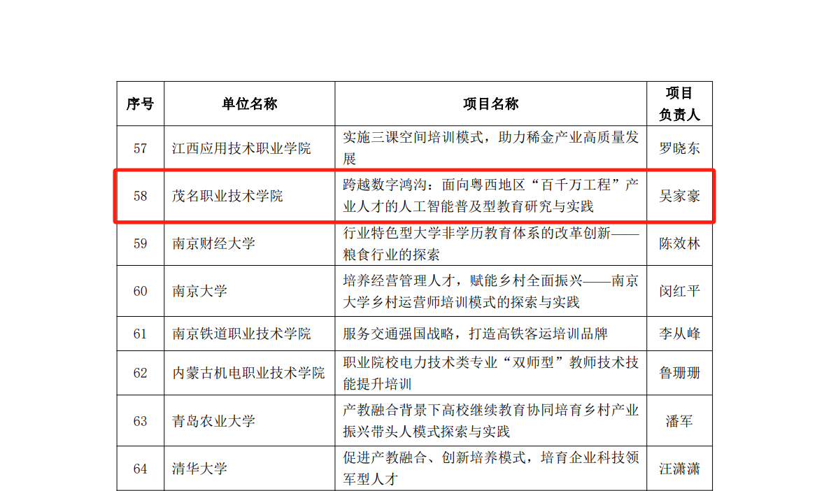 近日,为贯彻落实全国教育大会精神和深入实施学习型社会建设促进行动,教育部职业教育与成人教育司公示“2024年学习型社会建设重点任务(高等继续教育领域)培育建设项目”,我校吴家豪副教授团队项目《跨越数字鸿沟:面向粤西地区“百千万工程”产业人才的人工智能普及型教育研究与实践》立项为非学历教育改革创新任务。