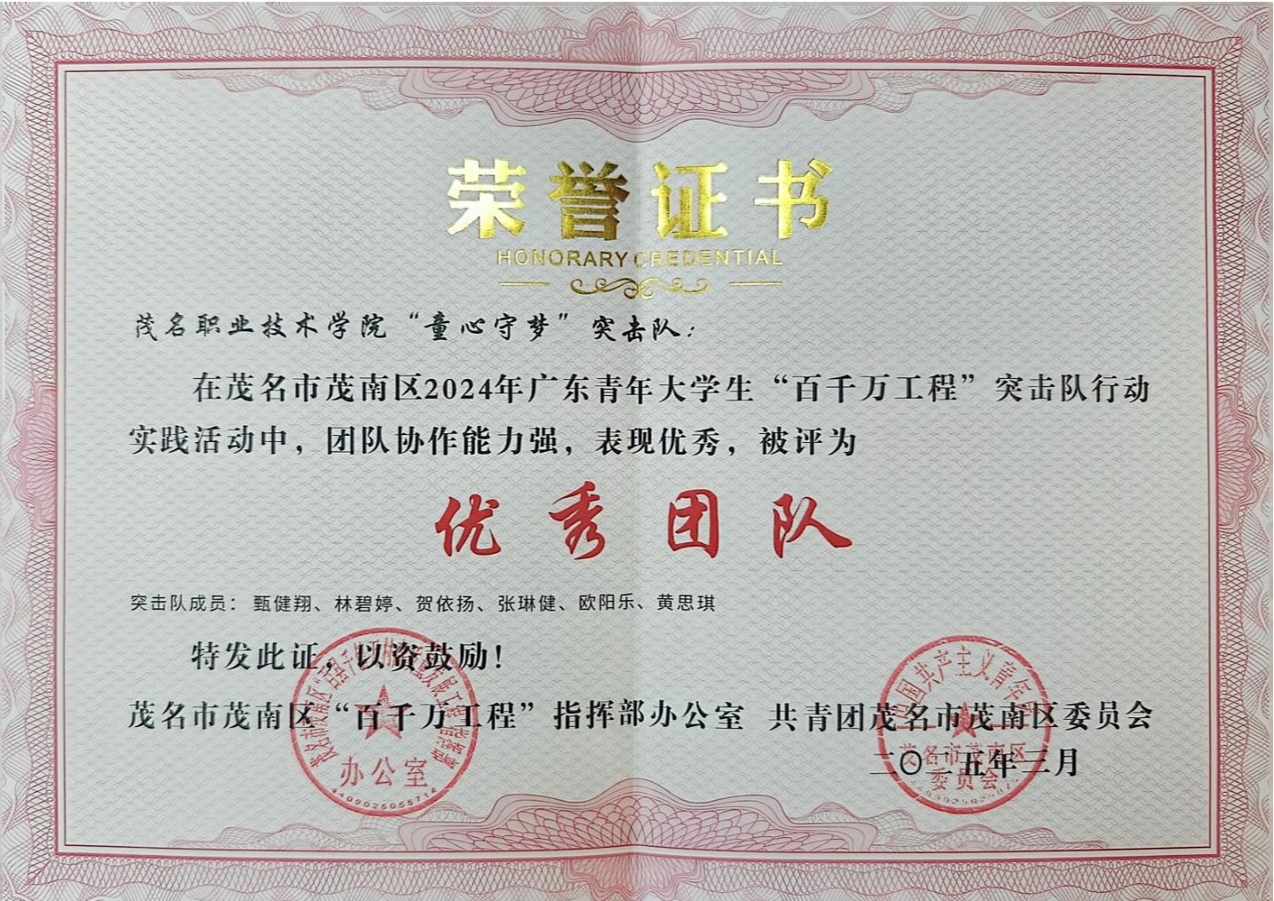 为深化广东青年大学生“百千万工程”突击队行动成效,推动高校资源与县镇村高质量发展深度融合,踊跃投身“百千万工程”建设热潮,3 月11 日上午共青团茂南区委员会召开2024年广东青年大学生“百千万工程”突击队行动成果展示会,我校“童心守梦”突击队被评为茂名市茂南区2024年广东青年大学生“百千万工程”突击队优秀团队,并作为优秀团队代表在会上做汇报分享。