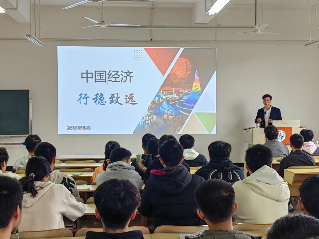 课堂上,董利首先从“发展信心从哪来”切入,以详实的数据和生动的案例,阐释了中国经济长期向好的基本面。他指出,党的领导是中国特色社会主义制度的最大优势,集中力量办大事的效能为经济高质量发展提供了坚实保障。20年间,我国GDP从15万亿跃升至130万亿,高技术产业投资增速大幅领先整体水平,集成电路、太阳能电池等产品产量保持两位数增长。从“新质生产力”的蓬勃发展到“双循环”新格局的加速构建,从科技创新突破到绿色转型实践,中国经济韧性强、潜力足、回旋余地广,这是我们应对挑战、赢得未来的底气;面对外部压力与内部挑战,董利以县域经济为例,揭示了中国经济“底盘稳”的深层逻辑:全国2800多个县级行政区贡献了四成GDP,覆盖数亿人口。十年间,“千亿县”增加50个,1200万人返乡创业带动超3400万乡村就业。“县域是中国经济最大的潜力所在,更是内需市场的根基。”从生产马面裙布料到露营装备材料,从屋顶光伏项目到清洁能源体系,县域经济正成为高质量发展的微观缩影;“关键核心技术的创新能力,是决定全球产业竞争的关键变量。”董利指出,中国正以先进制造业为主攻方向,布局新能源汽车、人工智能、生物医药等未来产业。他勉励应化学子:“既要深耕实验室,助力科技自立自强;也要投身绿色化工、新能源等国家战略领域。”