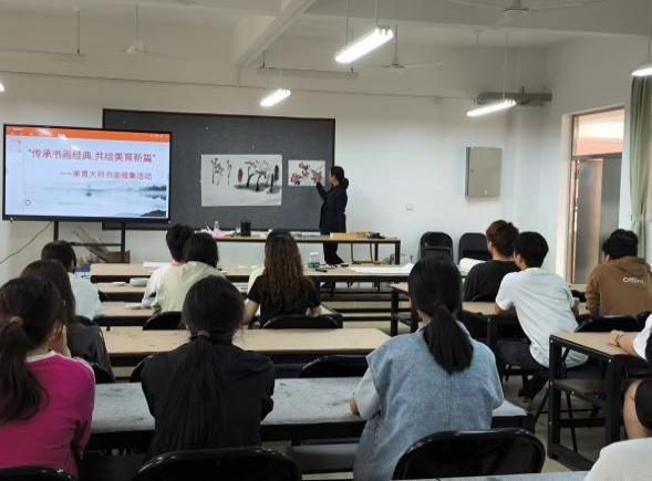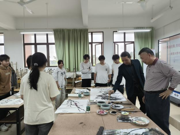 3月27日下午,基础课部美育教研室在学校南校区美育基地11栋203室举办了主题为“传承书画经典,共绘美育新篇”的师生书画雅集活动。活动邀请了茂名书画名家、学校美育教育教学指导委员会成员朱积、吴荣汉两位书画大师现场授课。师生欢聚一堂,通过书画艺术讲授、实践创作与艺术对话,呈现了一场传统书画艺术与高职美育深度融合的文化盛宴。