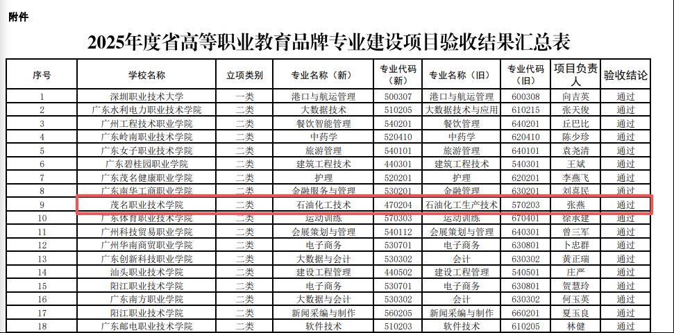 近日,广东省教育厅发布关于2025年度广东省高等职业教育品牌专业建设项目验收结果的公示,我校石油化工技术品牌专业通过验收,成为我校专业建设的重要标志性成果,标志着学校在高水平专业建设方面取得重要进展。