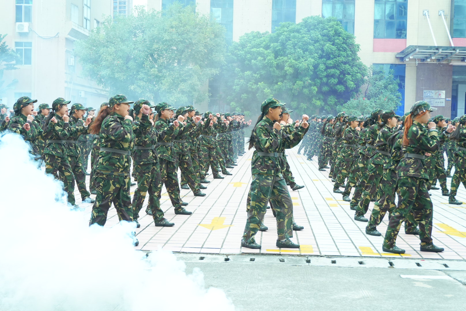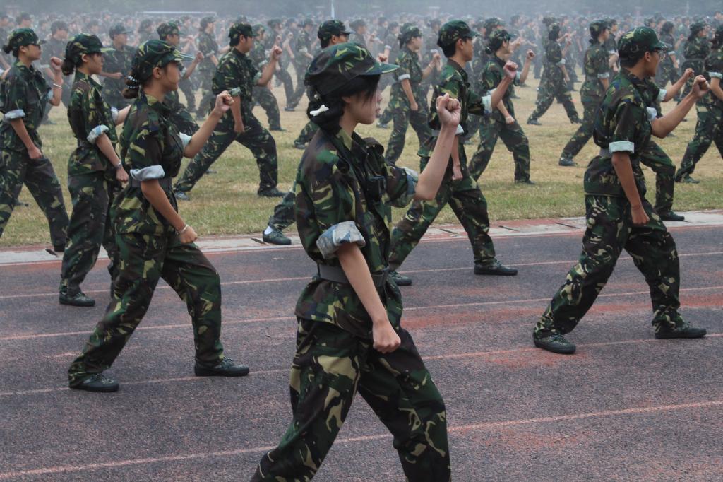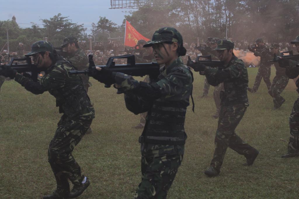 分列式后,军训成果展示精彩上演。军体拳方阵“哈!哈!”呐喊震彻云霄,出拳如疾风、踢腿似惊雷,每一个动作刚劲利落;擒敌拳方阵摔擒、锁控、夺械行云流水,尽显应急应变能力;匕首操方阵的女生们手持训练匕首,刺、劈、撩、挂动作娴熟,飒爽姿态打破“柔弱”标签,展现“巾帼不让须眉”风采。最引人瞩目的战术演练环节,新生们在模拟战场“硝烟”中快速卧倒、低姿匍匐、协同救护,贴近实战的操作不仅赢得阵阵掌声,更让“保家卫国”的信念深植心中。