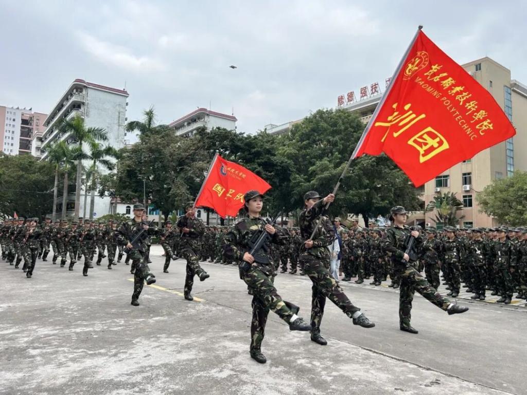 伴随着雄壮激昂的《分列式进行曲》,护旗方队擎着鲜艳的五星红旗,步伐铿锵、目光坚定,率先迈过主席台,鲜红的旗帜在晨光中猎猎飘扬,点燃全场热血氛围。随后,由新生组成的分列式方队身着统一军训服,迈着整齐划一的正步依次通过主席台——摆臂高度精准划一,落脚声响如惊雷阵阵,“团结拼搏!不负韶华!”“强国有我!请党放心!”的嘹亮口号响彻校园上空。新生们挺拔的身姿、坚毅的眼神、标准的动作,将14天里的汗水与坚持,化作眼前最动人的青春答卷。