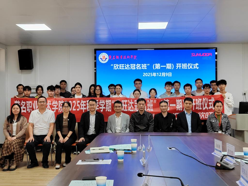 12 月 9 日下午,学院与欣旺达动力科技股份有限公司(以下简称:欣旺达)合作的“欣旺达冠名班”(第一期)订单班开班仪式在化工楼 211 举行。欣旺达设备工程部部长胡韩岳及电白基地多位高管,学院副院长董利、化工系负责人陈少峰、生化教研室主任、辅导员及23级订单班全体学员出席仪式。仪式由生化教研室主任邓小玲主持。