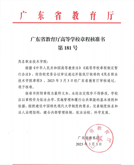 3月3日,广东省教育厅发布《广东省教育厅高等学校章程核准书(第181号)》,对《茂名职业技术学院章程(2023年修订》予以核准公布。核准书要求,学院应以章程作为依法自主办学、实施管理和履行公共职能的基本准则和依据,按照建设中国特色现代大学制度的要求,完善制度体系和法人治理结构,健全内部管理体制,依法治校、科学发展。