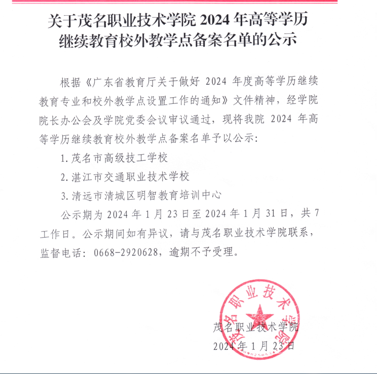 关于茂名职业技术学院2024年高等学历继续教育校外教学点备案名单的公示
