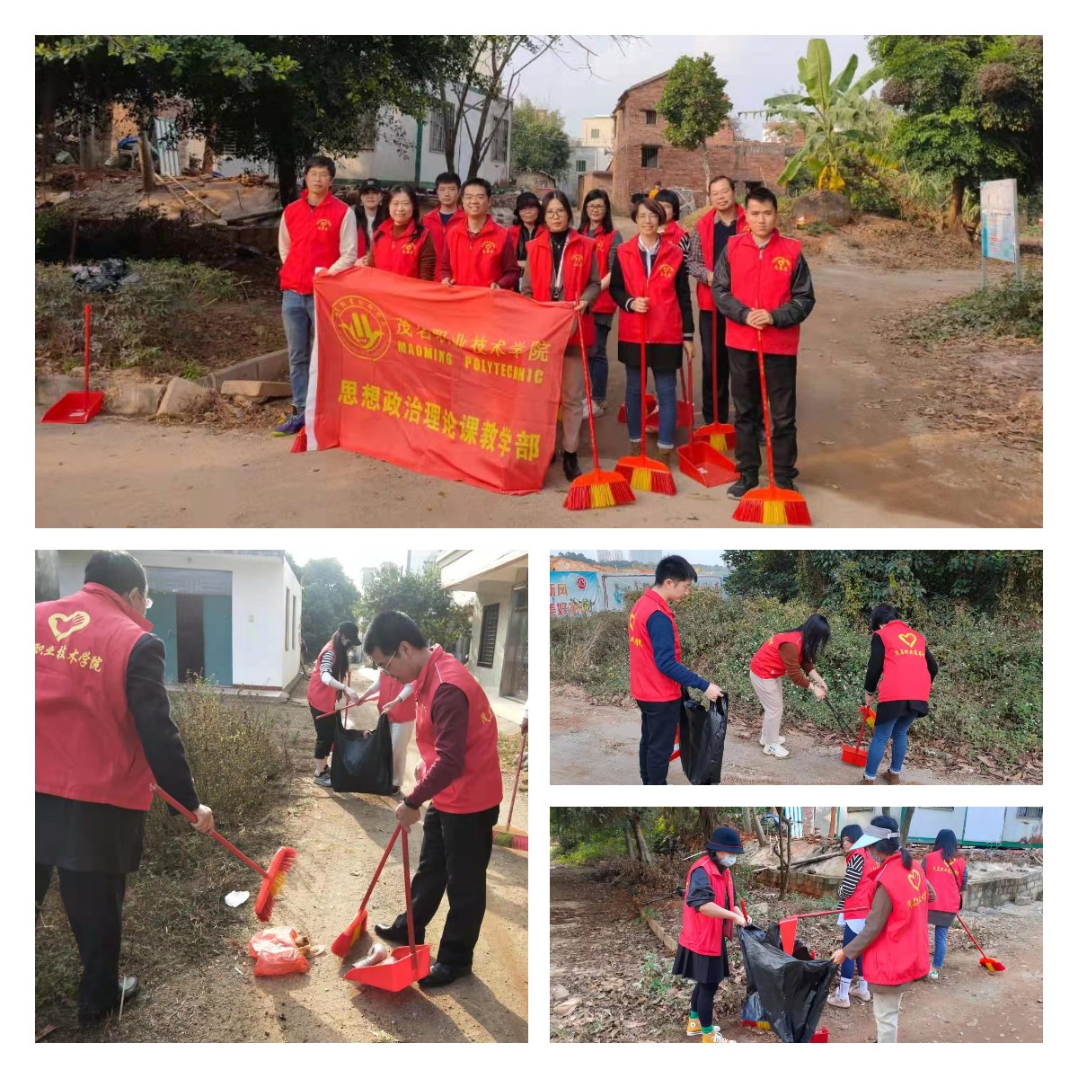 活动现场,思政部梁辉良主任将参加的教职工分为四组,分别负责不同的片区清扫,尽可能做到不留卫生死角。教职工志愿者们拿着扫帚、垃圾铲、夹子、垃圾袋,对包联村子主干道的塑料垃圾、烟头、生活垃圾等进行了认真清扫。正值茂名刚刚获得了国家卫生城市称号,通过这样的卫生清洁活动,志愿者们身体力行把卫生创建的成果巩固好,为建设“山海并茂、好心闻名现代化滨海绿城”做出自己的贡献。