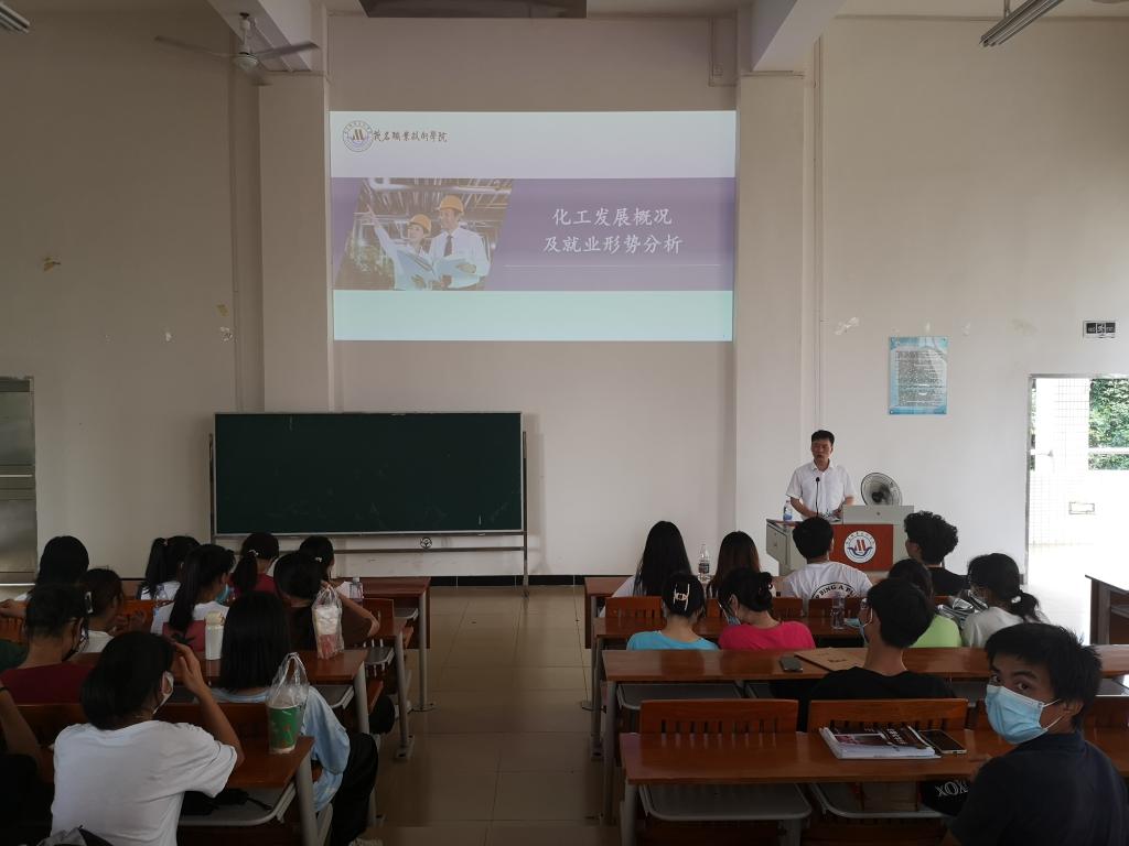 课堂上,董利介绍化工行业发展概况和发展趋势。希望每位同学要树立正确的就业观和择业观,需要抓住机遇,通过拼搏实现自己的职业梦想,并在各自的岗位上发扬工匠精神托起中国梦。接着,向同学们介绍了化工系历届毕业生的就业情况,并分析了广东省十四五规划中化工产业的布局。指出我校化工专业在广东省内就业是优势的,目前国际化工巨头巴斯夫、世界500强企业DIC和行业巨擘KALOON都计划在本系开展订单班培养模式,希望大家精心准备,踊跃参与。