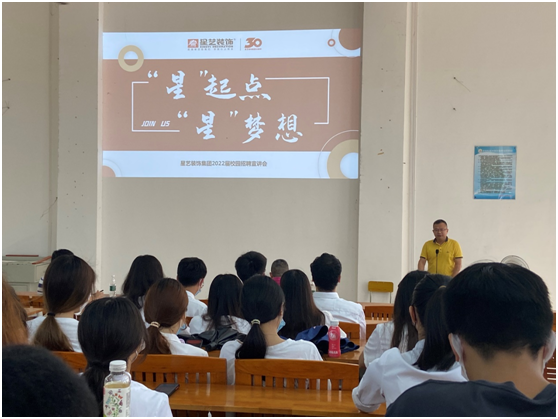 广东星艺装饰集团茂名分公司总经理陈守洪对集团的经营理念、集团业务、岗位安排与福利等进行了宣讲。据介绍,广东星艺装饰有限公司成立于1991年,是国家建筑装修工程施工一级,设计甲级企业单位,具有强大专业实力的大型装饰装修设计、施工企业和旗舰品牌。在装饰的道路中不断创新进取,从而实现让“每一位客户满意”的承诺。