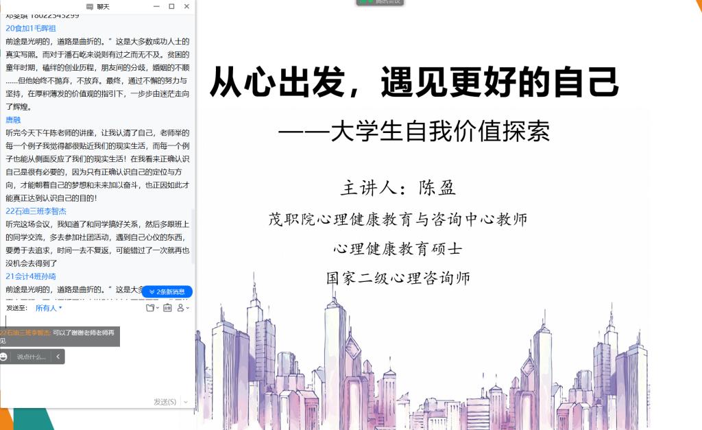 针对我校大学生普遍存在的“感觉很迷茫与生活没意义”的问题,我校心理健康教育与咨询中心于11月6日下午15:30-17:00在腾讯会议平台上组织开展了以《从心出发,遇见更好的自己——大学生自我价值探索》为主题的线上心理讲座,主讲人为陈盈老师,我校300名大学生积极参与。本次讲座通过讲述故事、活动体验与案例分析的形式展开,帮助参会同学接纳自我,澄清价值,积极行动。