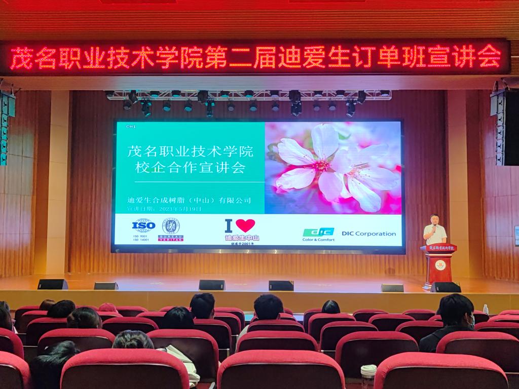 5月19日下午,化学工程系在学校南校区学术报告厅举办第二届“迪爱生订单班”宣讲会。迪爱生(东莞)油墨有限公司总经理高智慧,迪爱生合成树脂(中山)有限公司总经理马宇航,集团人力资源总监周修美等一行代表、化学工程系党总支副书记黄小翰以及2022级化工专业全体学生参加了宣讲会。会议由黄小翰主持。