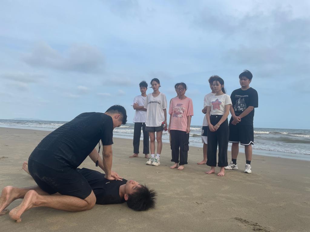 防溺水演练在中国第一滩海边进行。救生员王锐豪就溺水事件发生主要因素进行讲解,教导同学们从多方面认识溺水危险。介绍了防溺水安全须知、溺水时的自救方法、发现有人溺水时的救护和溺水者救上岸后的急救方法等防溺水知识。
