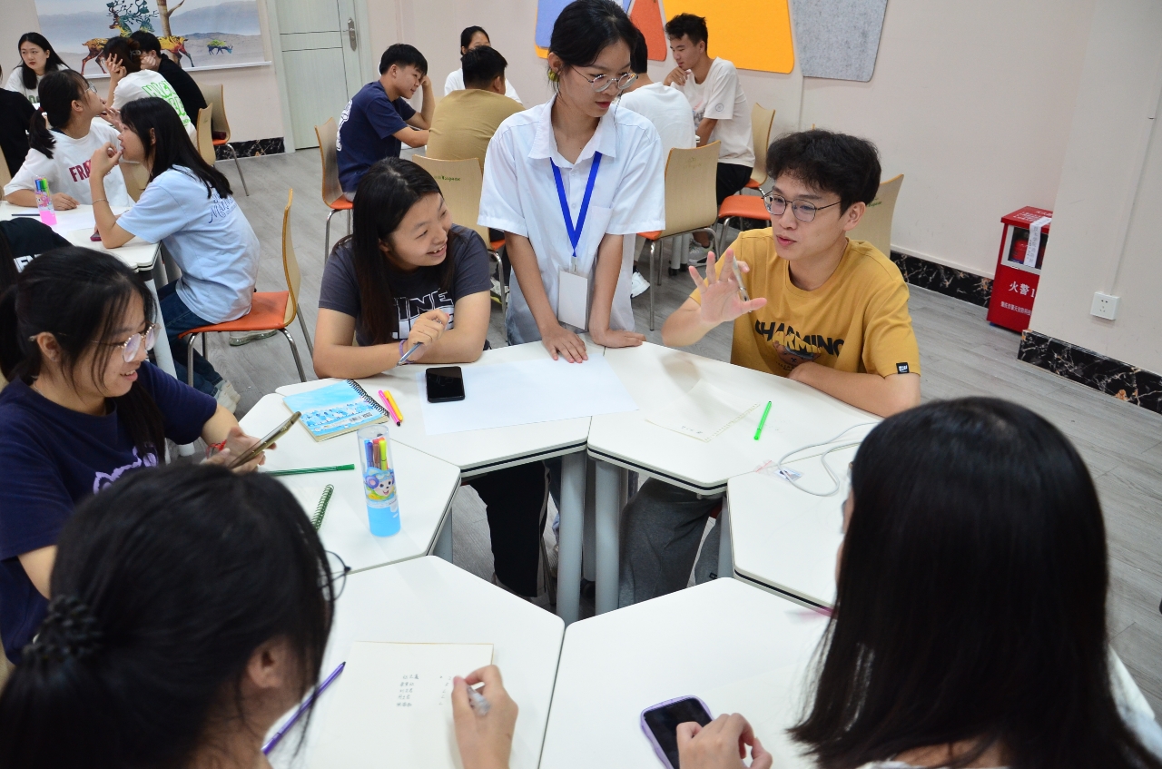 为了加快新生彼此的熟悉,训练营采用扑克牌分组,抽到同样幸运数字为一组,紧接着就是一个团队的诞生了,需要和组员一起协商设计队名、队徽和队训,然后小组进行展示。一开始新生们比较害羞,经过几轮活动环节,大家也慢慢投入进来,参与到活动环节中,逐渐适应自己大一新身份。