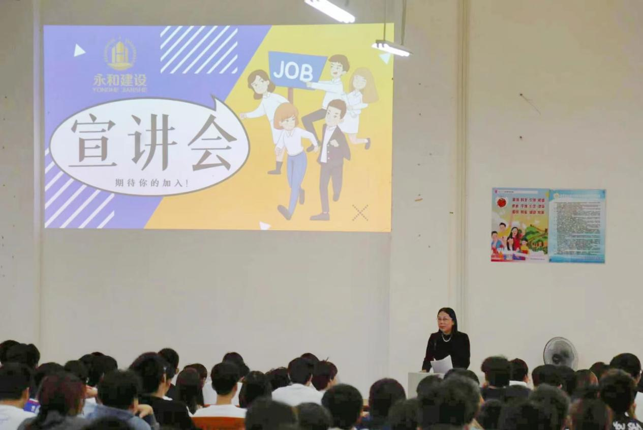 任帅对公司概况作了详细的介绍,广东永和建设集团有限公司成立于2007年3月,注册资金3亿元,拥有建筑工程施工总承包壹级、市政公用工程施工总承包壹级资质,目前是集教育、农业、大健康产业投资、房地产开发、工程设计、施工、建筑材料生产及销售、建筑劳务输出等为一体的大型综合施工企业。一直以来,集团始终秉承“诚信经营、止于至善、互利共赢、和谐发展”的经营理念和“勇于进取、追求卓越”的企业精神,得到了社会各界的充分肯定和取得了良好的信誉。集团高度重视企业员工的成长和提升,在员工福利、个人职业生涯提升等方面都有完善的制度,使企业员工能够长期保持较强的市场竞争力。黄江波介绍了永和订单班的具体情况。计划在建筑工程技术、建设工程管理、工程造价、供热通风与空调工程技术、道路与桥梁工程技术、智能建造技术等6个专业录取50人成立订单班。