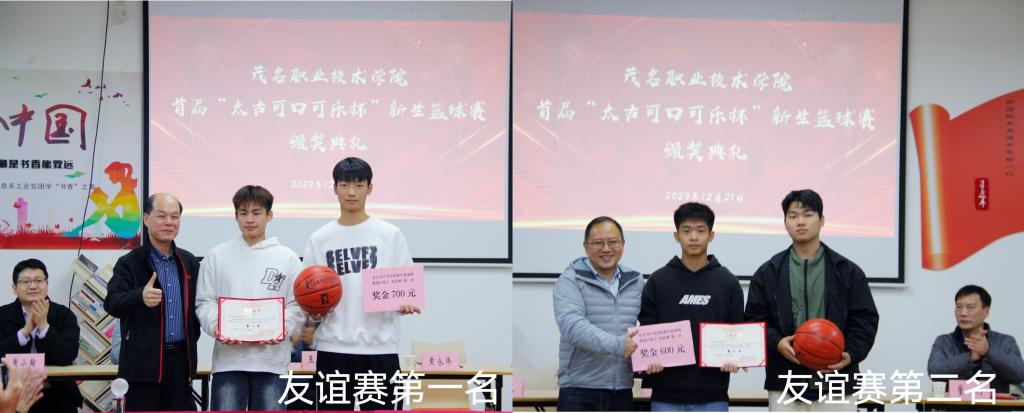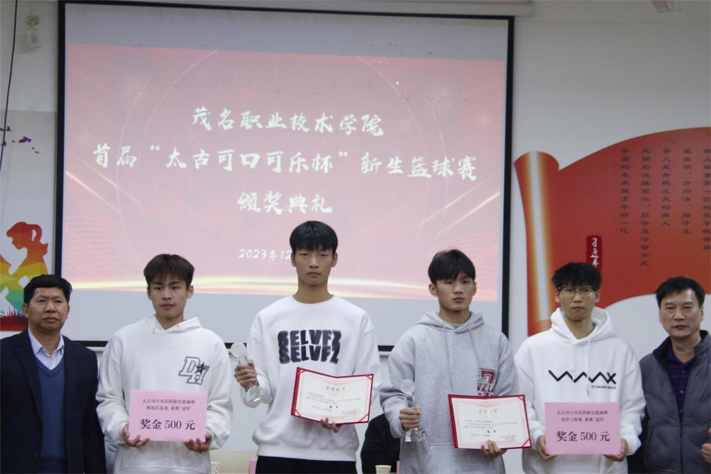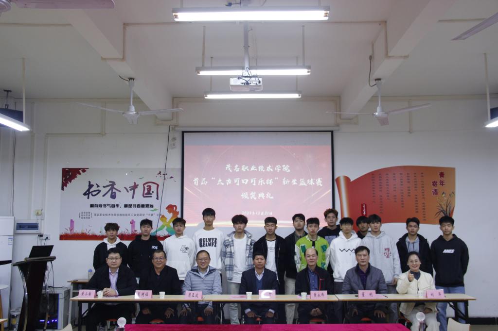 12月21日晚,茂名职业技术学院首届“太古可口可乐杯”新生篮球赛颁奖礼在南校区机电大楼党员活动室隆重举行。广东太古可口可乐有限公司人力资源总监黄永炜,可口可乐瓶装商生产(东莞)有限公司厂长周亚波、人力资源部经理刘萍,机电系、化工系领导王开、董利、彭树福、黄小翰一同出席活动并为获奖队伍代表颁奖,为近一个月热火朝天的篮坛龙虎斗画上了圆满的句号。