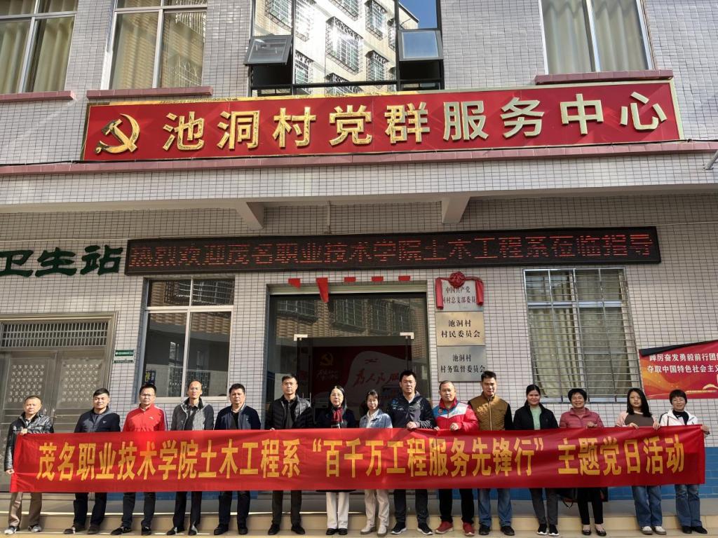 为深入贯彻党的二十大精神,落实广东省委和茂名市委关于实施“百县千镇万村高质量发展工程”部署要求,推动《茂名职业技术学院联系对接信宜市池洞镇开展“百县千镇万村高质量发展工程”工作实施方案》落地落实,1月4日上午,土木工程系党总支组织党员教师到池洞镇池洞村开展“百千万工程服务先锋行”主题党日活动。