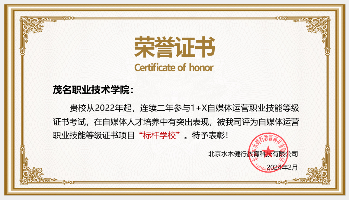 经过2023年的紧密合作与共同努力,抖音集团委托北京水木健行教育科技有限公司对该年度的考试和试点合作学校、个人进行了全面的评估与表彰。在这次表彰中,茂名职业技术学院荣获“标杆学校”称号,这不仅是对学院在自媒体运营职业技能培养方面成果的认可,也是对其教育理念和能力的高度评价。