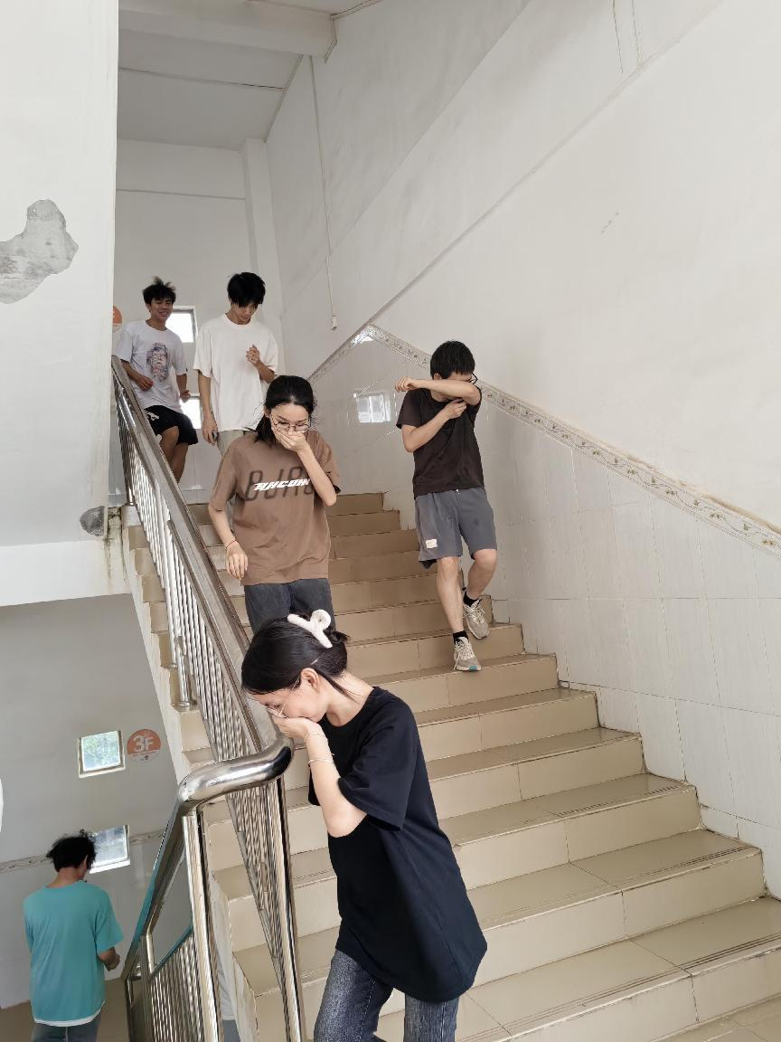 疏散逃生演练是活动的第一个环节。随着刺耳密集的警报声突然响起,同学们在老师的指引下,用衣服或手捂住抠鼻,迅速俯身撤离教室,沿着安全通道快步疏散。整个演练过程高效安全有序,达到了预期效果。活动的第二个环节是消防灭火器使用演练。消防安全员着重讲解示范了灭火器的正确使用方法,教导同学们面对轻微火情时如何冷静判断火势、风向和着火点,如何在安全范围内使用灭火器。消防安全员示范后,还邀请四个同学现场进行灭火操作,让师生对消防基础知识和灭火技能有了更清楚的认识。活动的第三个环节是消火栓安全用水的正确使用。通过消防安全员详细讲解、示范和同学们亲身体验,师生消防应急自救能力得到了锻炼和提升。