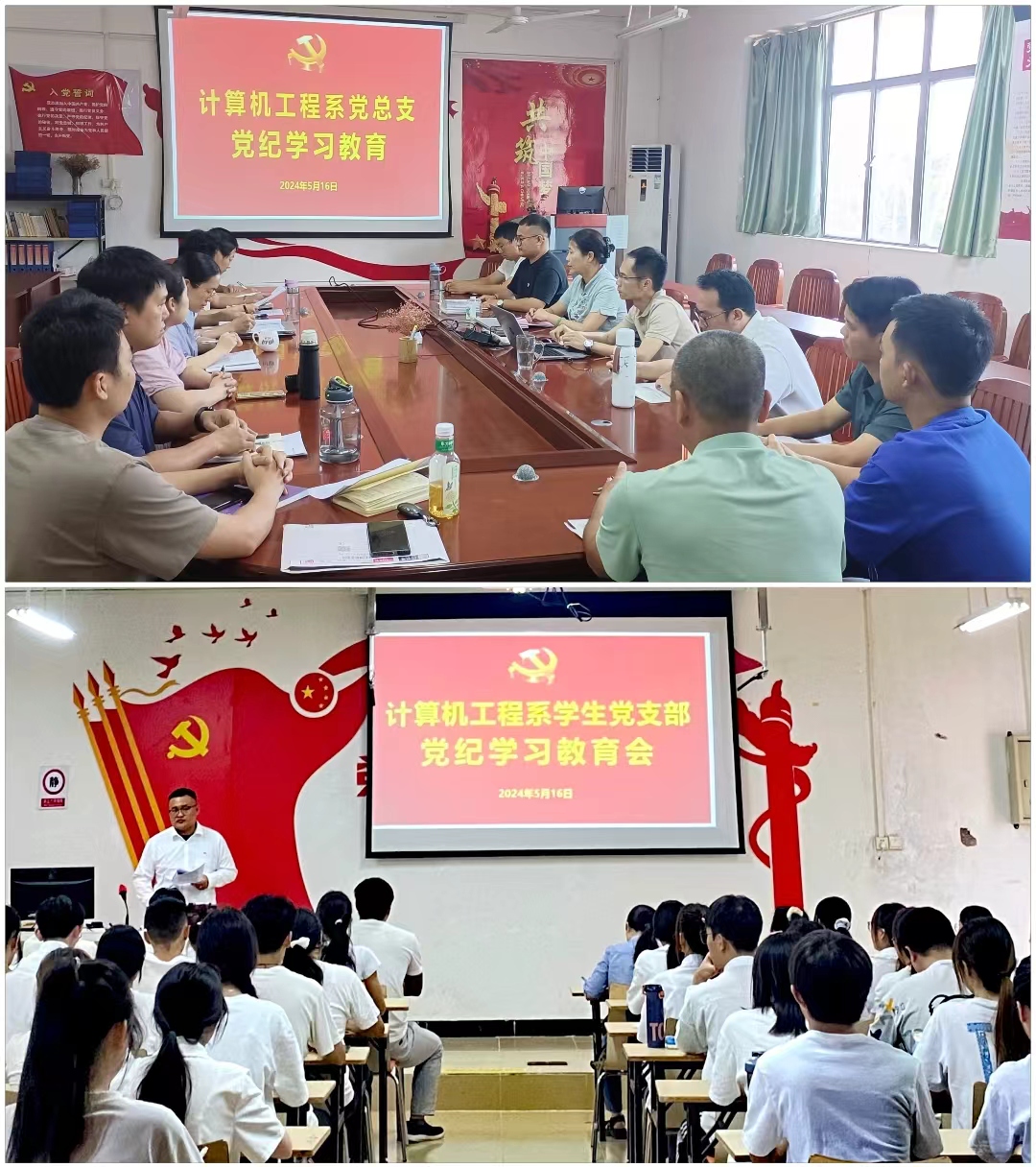 5月16日,计算机工程系党总支分别在南校区6号教学楼104教室、401会议室组织召开党纪学习教育专题学习会,计算机工程系师生党员、入党积极分子等共78人参学,系主任周洁文参会。
