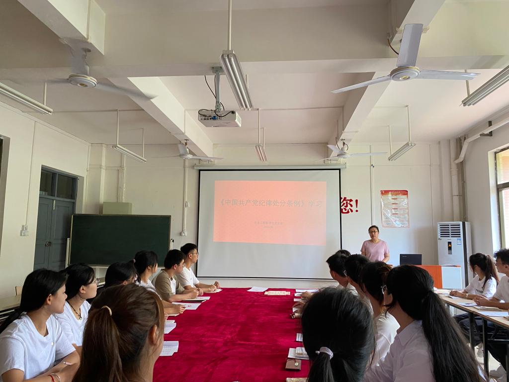 二十届中央纪委三次全会强调“纪律是管党治党的‘戒尺’,必须把严的标准树立起来、把严的纪律执行起来,推动广大党员干部切实养成纪律自觉”。带着对《中国共产党纪律处分条例》学习中的思考,化学工程系学生党支部于6月13日在南校区9-205组织开展《中国共产党纪律处分条例》专题党课学习。学生支部党员教师、全体积极分子、发展对象参加了本次专题党课学习。