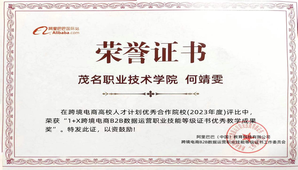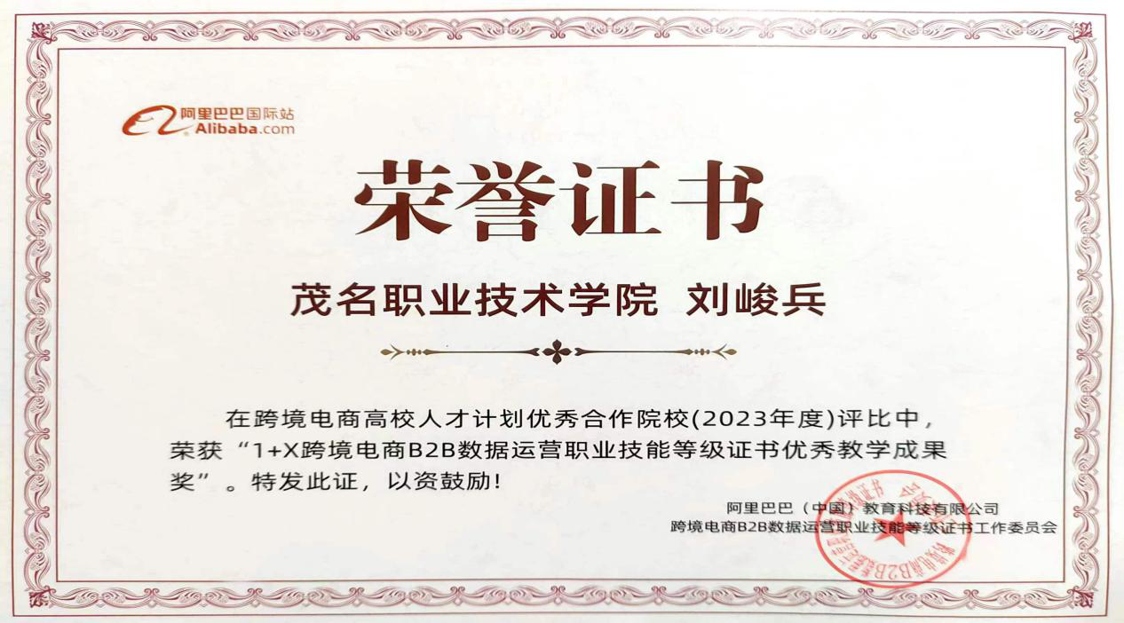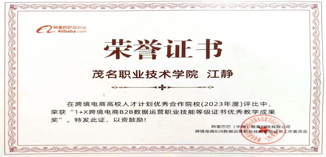 我院在2023年度“1+X”跨境电商B2B数据运营职业技能等级证书考证工作中表现突出,经济管理系刘峻兵、何靖雯、江静三位教师获得2023年度1+X跨境电商B2B数据运营职业技能等级证书优秀教学成果奖。