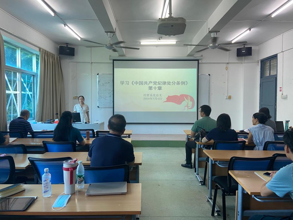 首先,经管系教工党支部组织委员阮斯媚领学第一议题,学习《中国共产党纪律处分条例》第十章,强调要把《条例》学习作为加强理论武装、强化思想素养、提高思想境界的重要方法、重要途径及重要载体,深刻领会精神实质和核心要义。