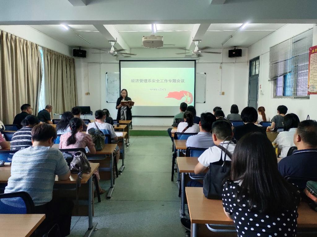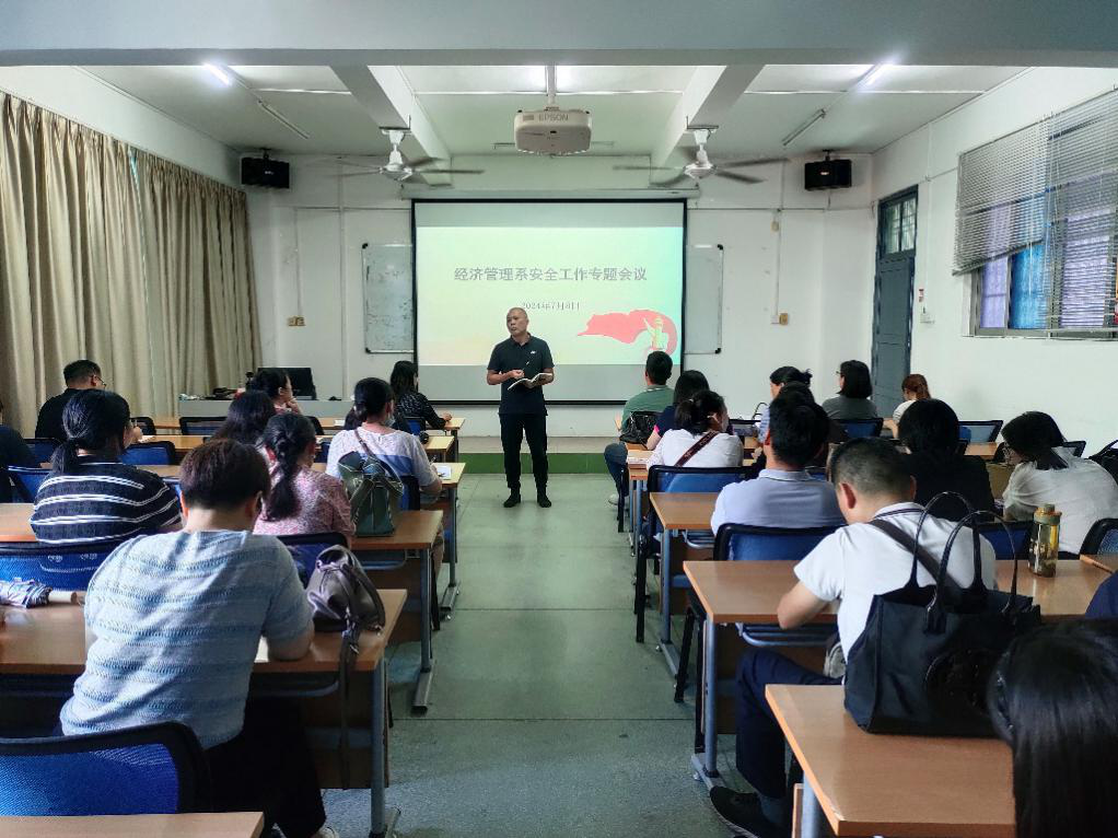 首先,由经管系党总支副书记黄劲传达了茂名市和学院安全紧急工作会议精神,提出在特殊防护期,全体师生要牢固树立政治意识、安全意识,服从各项安全工作安排和要求。重点工作包括学生假期去向和动态关注、暑期“三下乡”社会实践和“百千万工程”开展安全、假期宿舍安全提醒和安全教育,如交通安全、防诈骗宣传教育等。