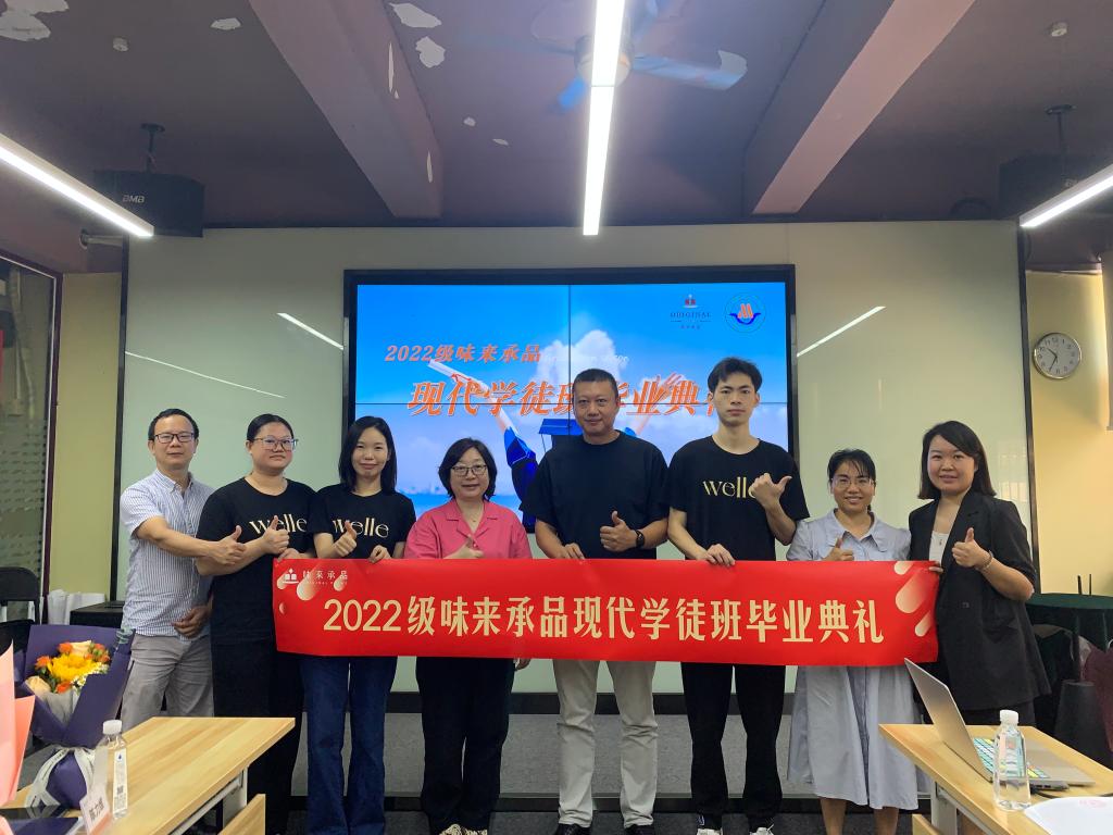 7月20日,我院化学工程系的食品教研室主任张榕欣副教授、食加教研室主任左映平副教授、辅导员李世林老师赴珠海市味来承品餐饮管理有限公司举行2024届食品智能加工技术专业“现代学徒制”味来承品现代学徒班毕业典礼。珠海味来承品餐饮管理有限公司董事长特助林殿国、运营总监兼产品总监蒋凤婵及部分毕业学员参加了活动。