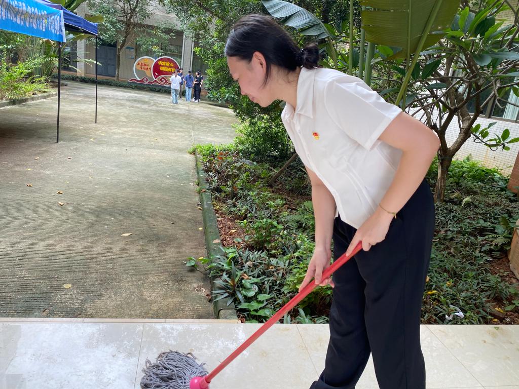 由于台风影响,报到现场地面因踩踏脏污,为了保持地面整洁,有学生党员细心打扫。