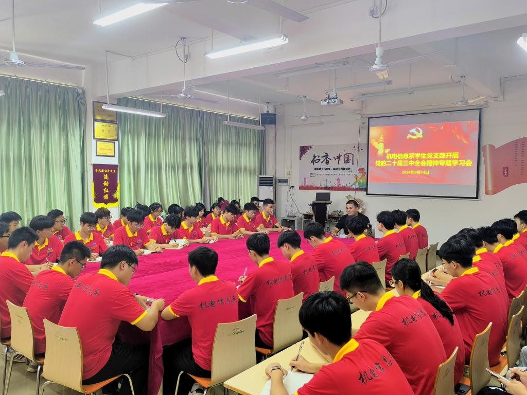 为深入学习贯彻党的二十届三中全会精神,进一步强化思想引领,9月14日中午,机电信息系学生党支部组织全体学生党员和入党积极分子在南校区7号大楼党员活动中心举行专题学习会,努力把学习成果转化为坚定前行的强大精神动力。