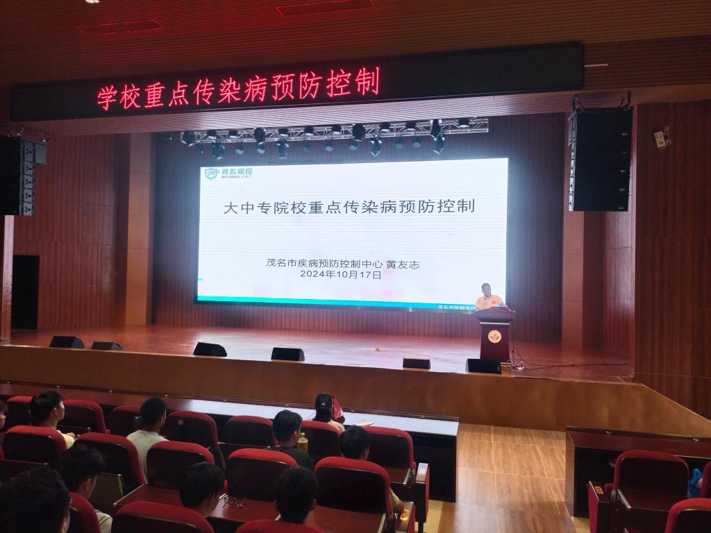为做好2024年秋冬季传染病防控工作,有效防控登革热等传染病的发生和流行,学校邀请茂名市疾控中心流行病防控科专家黄友志10月17日到南校区宣讲学校重点传染病预防控制知识,南校区各系师生约550人参与讲座。