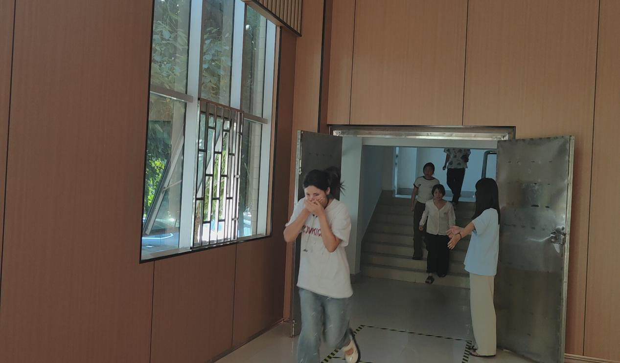 最后,在北校区图书馆,就馆内读者现场开展馆内应急疏散演练,图书馆工作人员各司其职,引导馆内读者捂住口鼻、降低重心、快速有序地通过安全出口撤离至馆外。