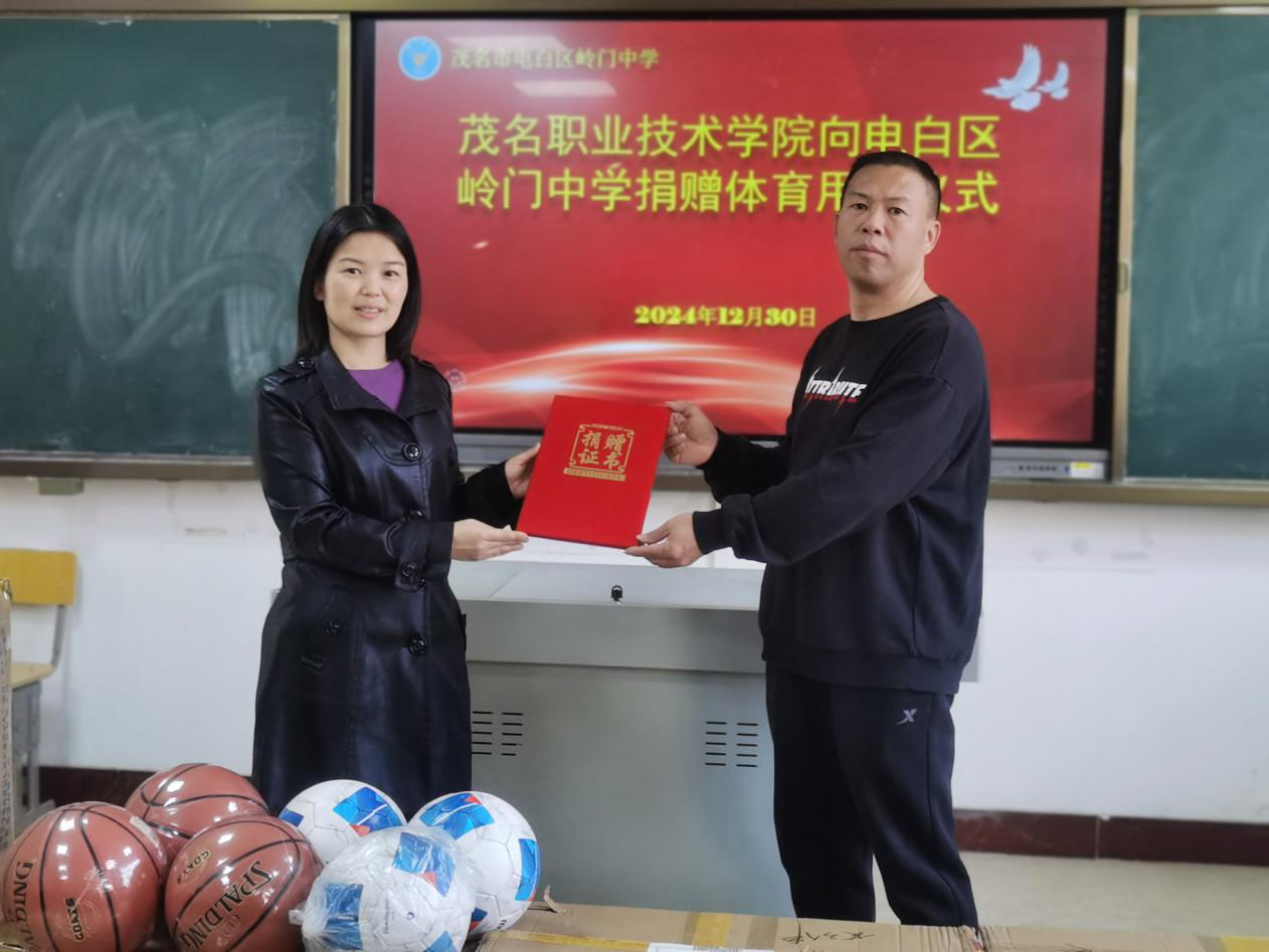 为了贯彻落实省政府关于推动基础教育高质量发展行动方案,切实做好我校基础帮扶工作,12月30日下午,学院基础课部主任卢火艳一行到电白区岭门中学调研学校体育工作。我校向岭门中学捐赠一批体育用品,学院基础课部副主任黄丽、岭门中学副校长陈得春和两校部分教师出席捐赠仪式。