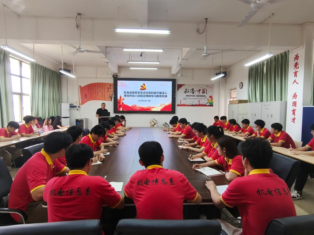 4月10日,机电信息系学生党支部书记张汉军以“深入学习贯彻中央八项规定精神,积极推进主题学习教育”为题,为全体学生党员、入党积极分子上党课,引导同学们深刻领悟主题学习教育的重大意义,不断提高政治站位,坚持把中央八项规定作为党性锻炼的铁规矩、硬杠杠,坚定拥护 “两个确立”,坚决做到“两个维护”,以高度的政治自觉、思想自觉和行动自觉全身心投入到学习教育中去。