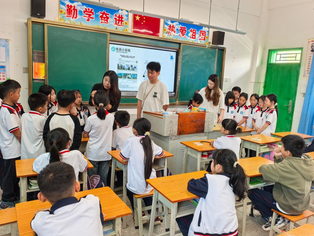 下一站,同学们来到了河源忠信镇大陂益海小学进行主题为“营养与健康同行,科普让生活更美好”的支教活动,活动中同学们为小学生讲解“食品安全知识”,与小学生互动交流,耐心引导他们树立正确的饮食观念,孩子们听得十分专注,踊跃回答问题,同时我们为他们提供了精美的奖品《食品安全知识科普小册子》。最后,进行了食品安全快检的现场体验活动,详细讲解如何利用快检试剂盒来检测蔬菜中的农药残留,现场气氛十分活跃。
