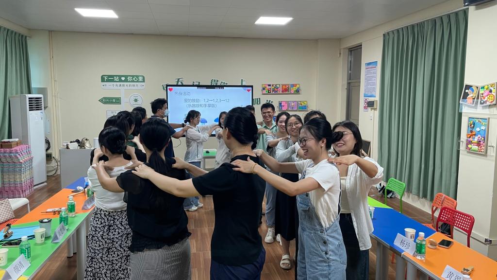 活动以“爱的鼓励”和“爱的传递”破冰环节拉开序幕。辅导员们通过节奏轻快的掌声和肢体语言传递支持与关怀,迅速拉近距离,现场氛围温暖融洽。周海丽老师表示:“希望以游戏为载体,引导大家感受团队支持的力量。”