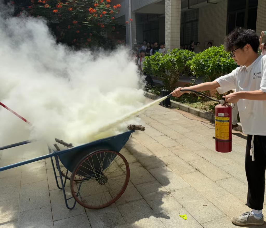 接着,进入了实际操作环节。实训室成老师现场示范了灭火器的正确使用方法,包括如何检查灭火器是否完好、如何拔掉保险销以及如何对准火源进行喷射等步骤。在实训室老师的指导下,师生们依次亲身体验了灭火器的使用,成功将模拟火源扑灭。整个过程中,大家积极参与,认真学习,现场气氛热烈而有序。