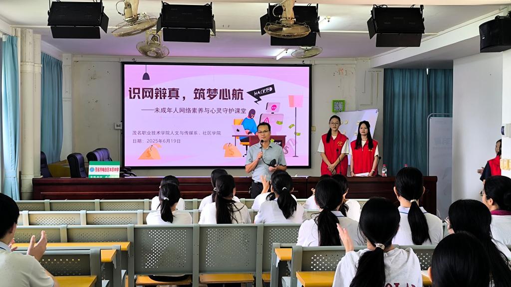 为提高未成年人安全、健康、文明上网能力,6月19日,茂名职业技术学院人文与传媒系联合社区学院、电白区沙院镇社工站,在沙院镇木苏中学举办主题为“识网辩真,筑梦心航”的未成年人网络素养与心灵守护课堂活动。